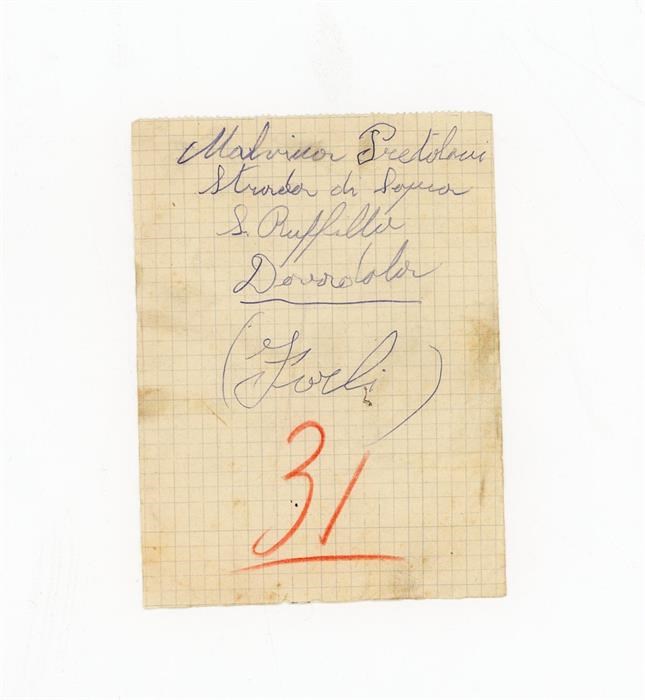 Bigliettino anonimo con l'indicazione di un nome, Pretolini Malvina, e di un luogo, la località di San Ruffillo a Dovadola, provincia di Forlì.