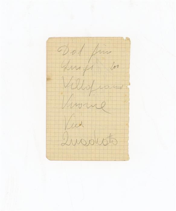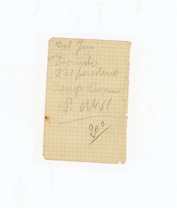 Bigliettino anonimo con le indicazioni dei nomi di Dal Pino Luigi e Dal Pino Danilo e dei luoghi di Villafranca di Verona e Como.