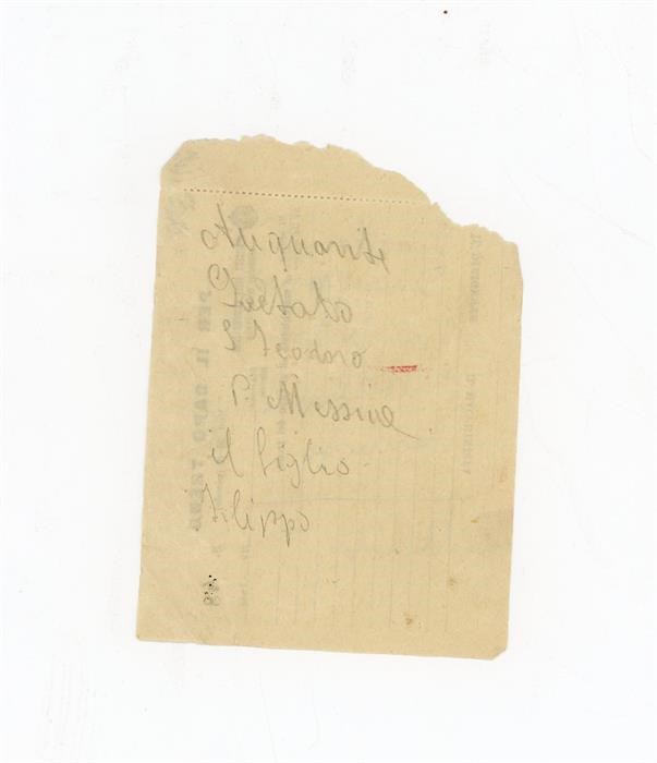 Bigliettino di Acquavite Filippo al padre Acquavite Gaetano, con l'indicazione di un luogo, San Teodoro, in provincia di Messina; bigliettino anonimo alla moglie Fiorello Giuseppina, di Castellaneta, in provincia di Taranto. È presente l'indirizzo.
