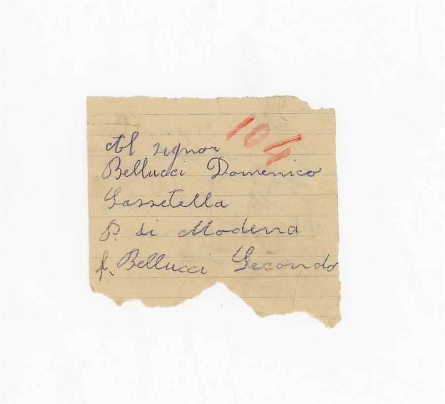 Bigliettino di Bellucci Secondo al padre Bellucci Domenico, con l'indicazione della località di Sassatella, in provincia di Modena.