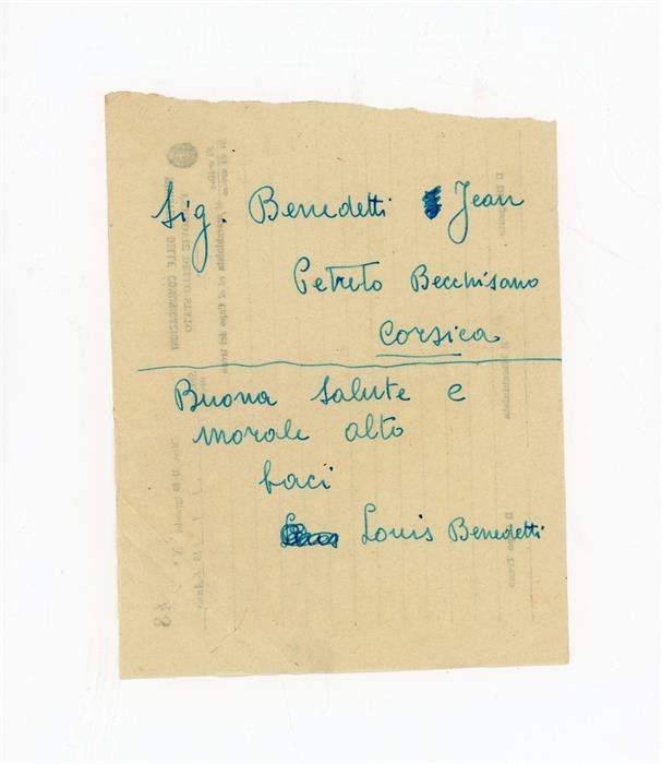 Bigliettino di Benedetti Louis con l'indicazione di un nome, Benedetti Jean, e di un luogo, Petreto-Bicchisano, Corsica. Il soldato deportato comunica di stare bene. È presente la traduzione del messaggio in italiano.