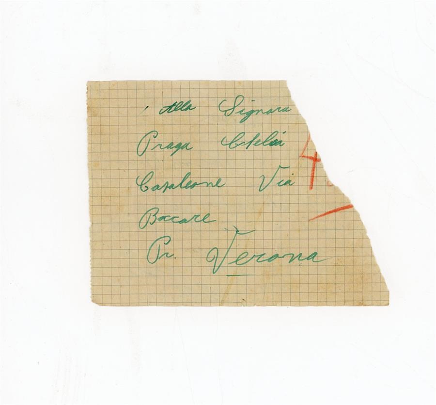 Bigliettino di Bruno alla signora Praga Ofelia, di Casaleone, in provincia di Verona. È presente l'indirizzo. Il bigliettino contiene una lettera di difficile comprensione poiché parzialmente strappata.
