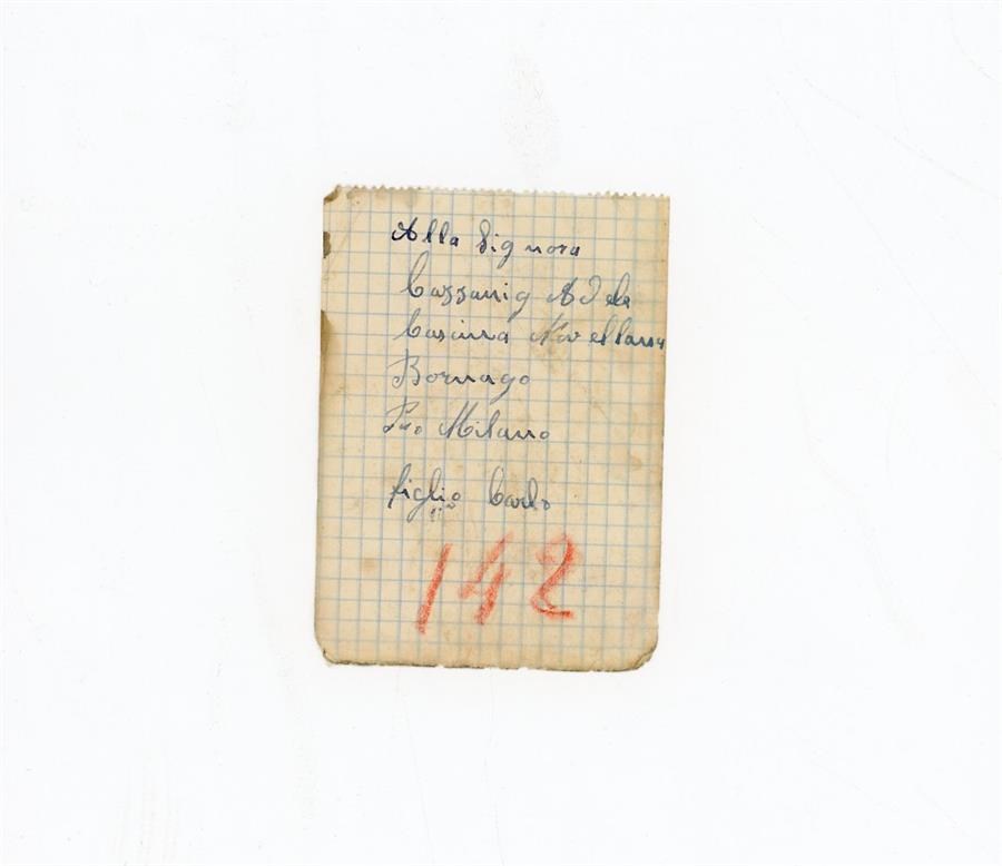 Bigliettino di Carlo alla madre Cazzaniga Adele, con le indicazioni delle località di Cascina Novellana e Bornago, entrambe in provincia di Milano.