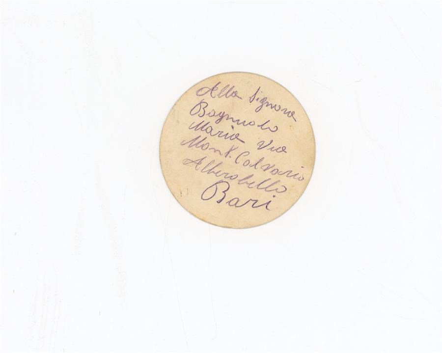 Bigliettino di Cosimo alla madre Bagnuolo Maria, di Alberobello, in provincia di Bari. È presente l'indirizzo.
