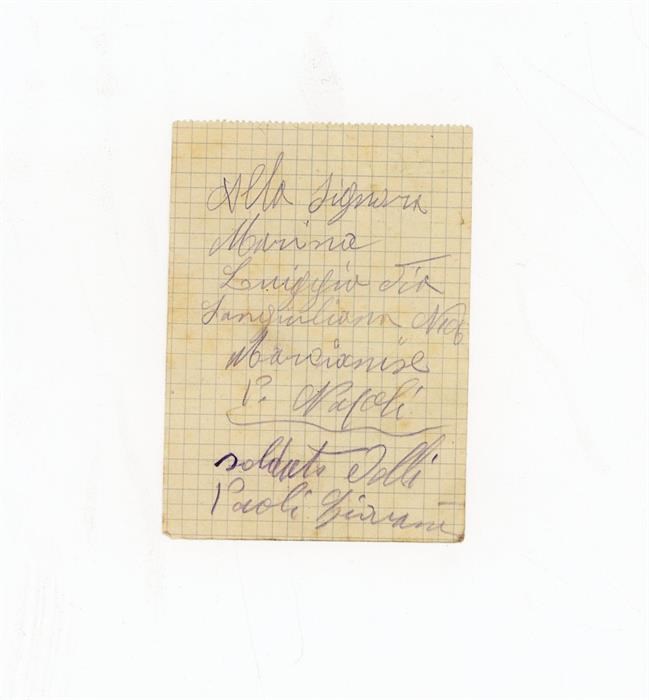 Bigliettino di Delli Paoli Giovanni alla signora Marina Luiggia (sic? Luigia) di Marcianise, all'epoca in provincia di Napoli, ora in provincia di Caserta. È presente l'indirizzo.