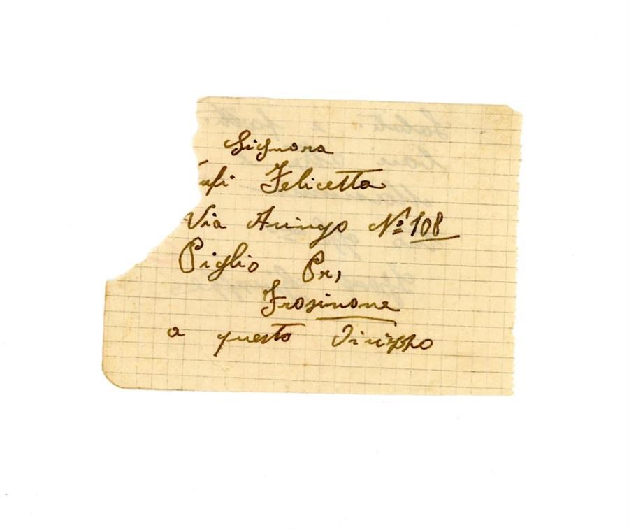 Bigliettino di saluti di Giuseppe alla moglie Tufi Felicetta, di Piglio, provincia di Frosinone. È presente l'indirizzo. Il soldato deportato manda baci alla moglie e alla madre.