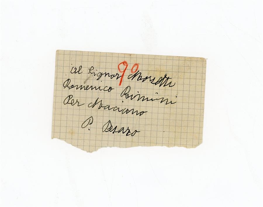 Bigliettino di Luinto al signor Marzotti Domenico con l'indicazione dei luoghi di Maciano, località attualtmente in provincia di Rimini, e Rimini, che all'epoca si trovava in provincia di Pesaro.