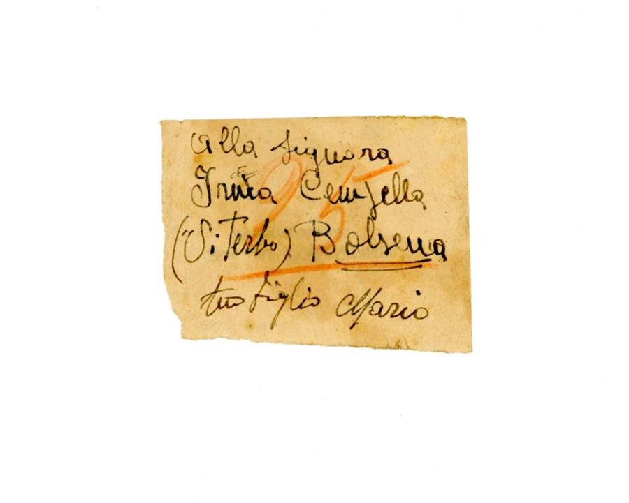 Bigliettino di Mario alla madre [Cenapella] Irma, con l'indicazione di un luogo, Bolsena, in provincia di Viterbo.
