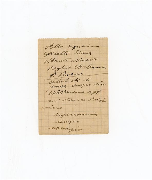 Bigliettino di saluti di Nazzareno alla signorina Ghiselli Dina, con le indicazioni dei luoghi di Peglio e Urbania, entrambi in provincia di Pesaro Urbino. Il soldato deportato di pensarla sempre e di trovarsi prigioniero in Germania.