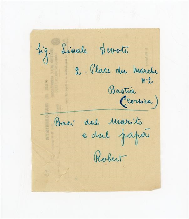 Bigliettino di Robert, con l'indicazione di un nome Linale Devote, di Bastia, Corsica. È presente l'indirizzo. Il soldato deportato manda baci alla moglie e ai figli. È presente la traduzione del messaggio in italiano.