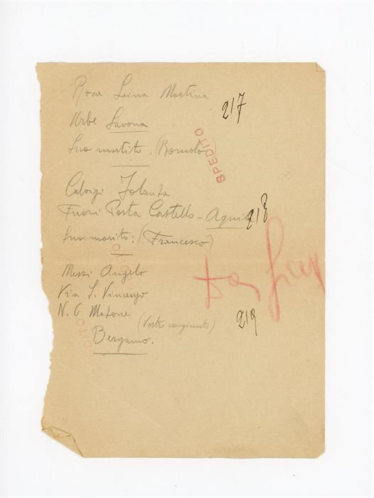 Bigliettino di Romolo alla moglie Roca Lina Martina, con l'indicazione di un luogo, Urbe, in provincia di Savona; bigliettino di Francesco alla moglie Calvigi Iolanda, con l'indicazione di un luogo, L'Aquila; bigliettino anonimo di un congiunto a Messi Angelo, di Madone, in provincia di Bergamo. È presente l'indirizzo.