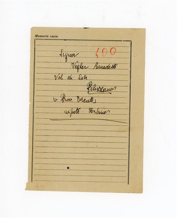 Bigliettino di [Sabino] allo zio Vegher Benedetto con l'indicazione del luogo di Pellizzano, Val di Sole, in provincia di Trento.