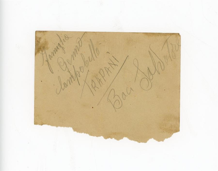 Bigliettino di Salvatore alla famiglia Genna, con l'indicazione di un luogo Campobello di Mazara, in provincia di Trapani. Il soldato deportato manda baci.