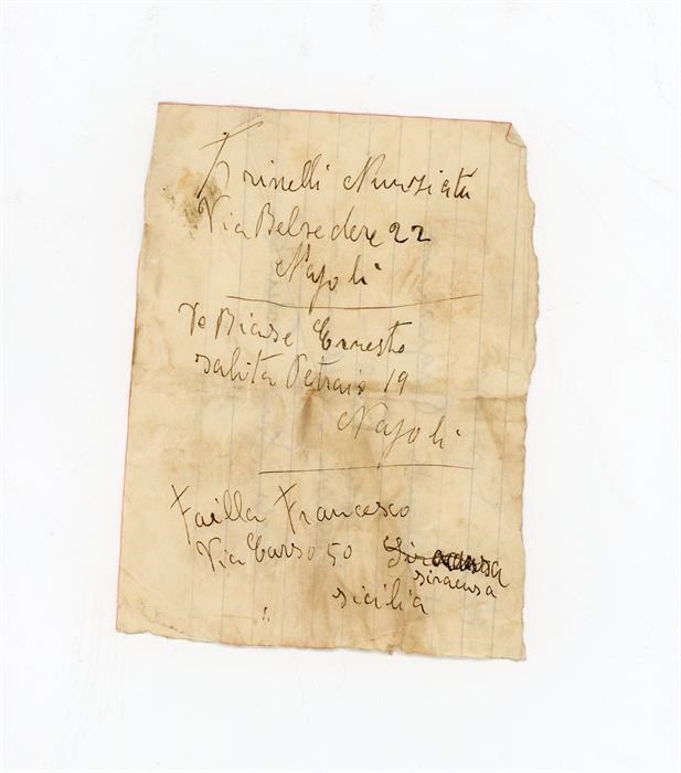 Bigliettino di Valente alla signorina Ingenito Pasqualina, di Maiori, in provincia di Salerno. È presente l'indirizzo. Il soldato deportato manda baci; bigliettino anonimo con l'indicazione di un nome, Trivelli Nunziata, di Napoli. È presente l'indirirzzo; bigliettino anonimo con l'indicazione di un nome, De Biase Ernesto, di Napoli. È presente l'indirizzo; bigliettino anonimo con l'indicazione di un nome, Failla Francesco, di Siracusa. È presente l'indirizzo.