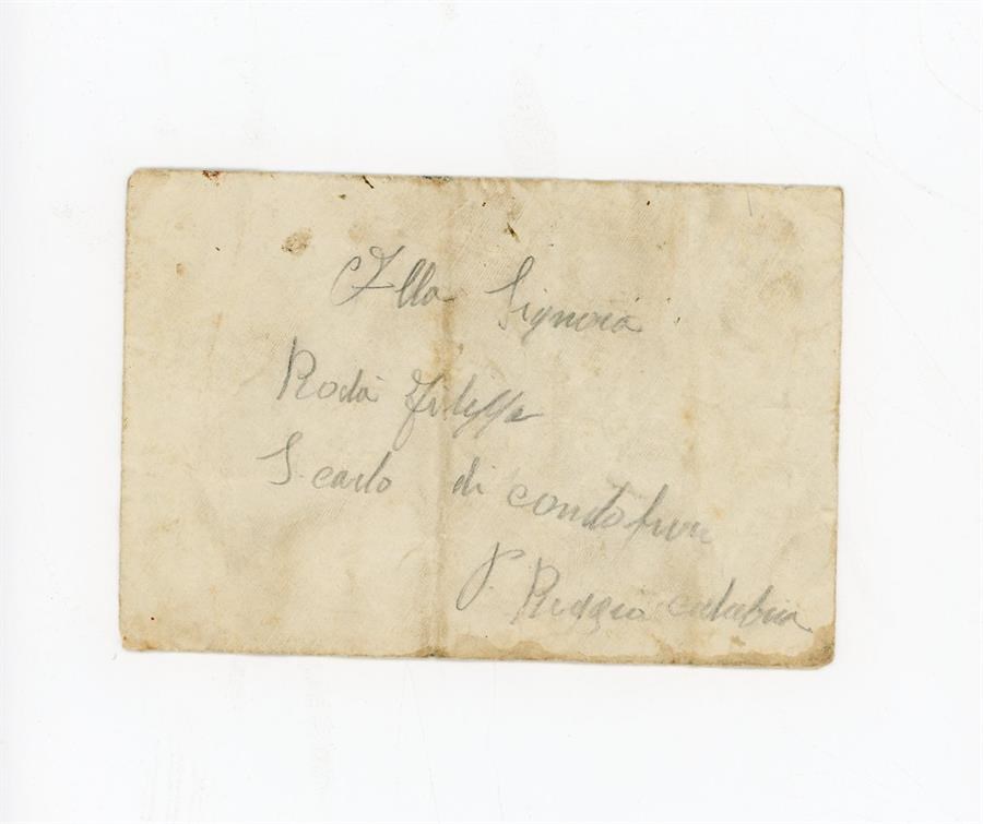 Busta anonima alla signora Roda Filippa, con l'indicazione della località di San Carlo di Condofuri, in provincia di Reggio Calabria; busta anonima alla signora Morelli Fondo (sic? figlia) di Pasquale, del quartiere Giostra di Messina. È presente l'indirizzo. L'autore anonimo ringrazia. Non è presente il contenuto della busta.