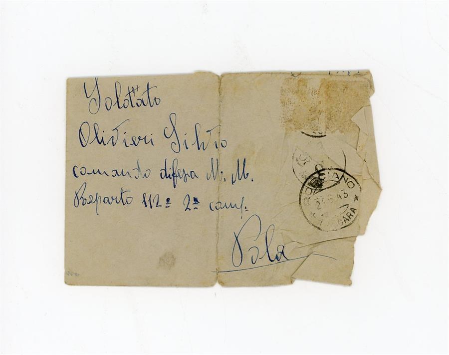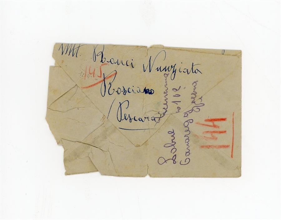 Busta di Ronci Nunziata di Rosciano, in provincia di Pescara per il soldato Olivieri Silvio, di stanza a Pola, Istria; busta anonima con l'indicazione di un nome, Lobue Vicenzina (sic? Vincenzina) e di un luogo, Canareggio, in provincia di Venezia. Non è presente il contenuto.