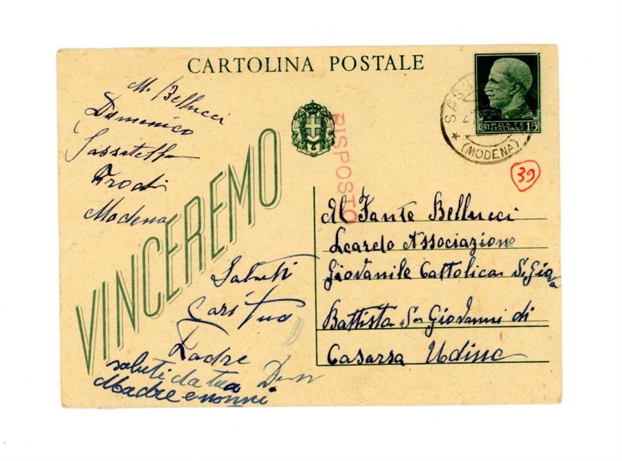 Cartolina postale di saluti di Bellucci Domenico al figlio deportato, inviata all'Associazione Giovanile Cattolica di San Giovanni di Casarsa. Il mittente scrive dalla località di Sassatella di Frassinoro, in provincia di Modena.