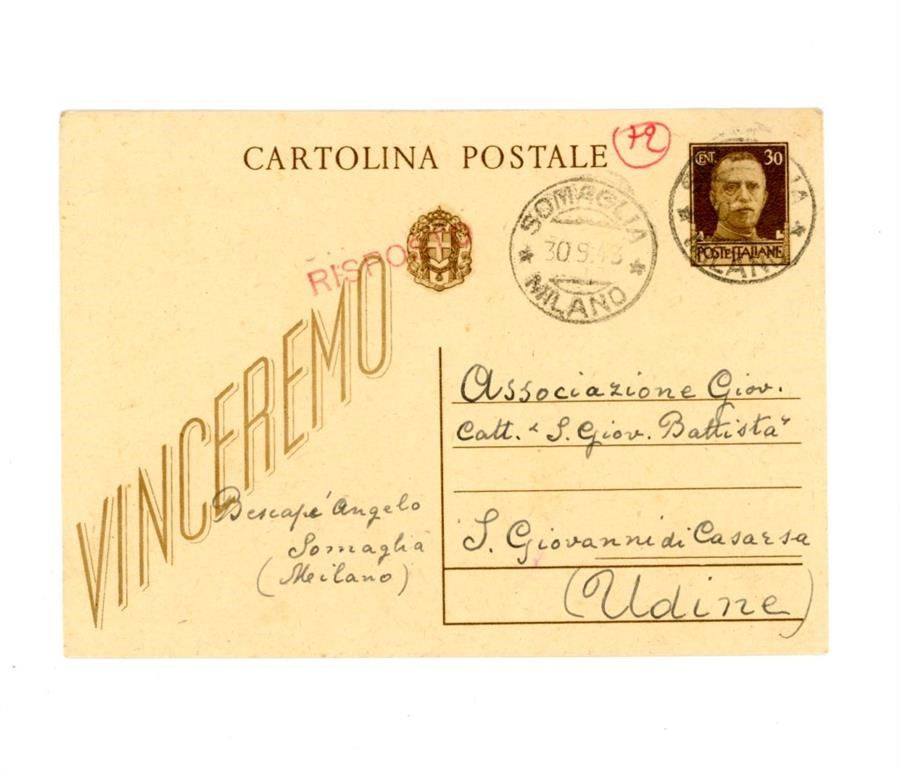 Cartolina postale di ringraziamento e richiesta di informazioni all'Associazione Giovanile Cattolica di San Giovanni di Casarsa da parte di Bescapè Angelo, riguardo al figlio Bescapè Giuseppe. Il mittente scrive da Somaglia, all'epoca in provincia di Milano, ora in provincia di Lodi. Il mittente chiede di sapere in che campo di concentramento si trova il figlio.