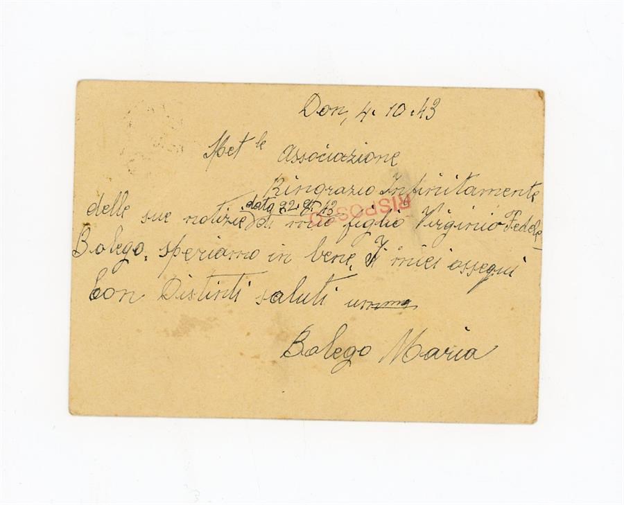 Cartolina postale di ringraziamento all'Associazione Giovanile Cattolica di San Giovanni di Casarsa di Bolego Maria, per aver ricevuto notizie del figlio Bolego Virginio Fedele. Il mittente scrive da Cavareno, in provincia di Trento.