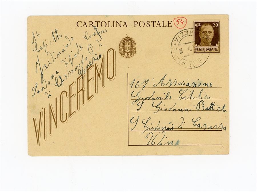 Cartolina postale di ringraziamento all'Associazione Giovanile Cattolica di San Giovanni di Casarsa da parte di Capiotto Ferdinando. Il mittente scrive da San Donà di Piave, in provincia di Venezia.
