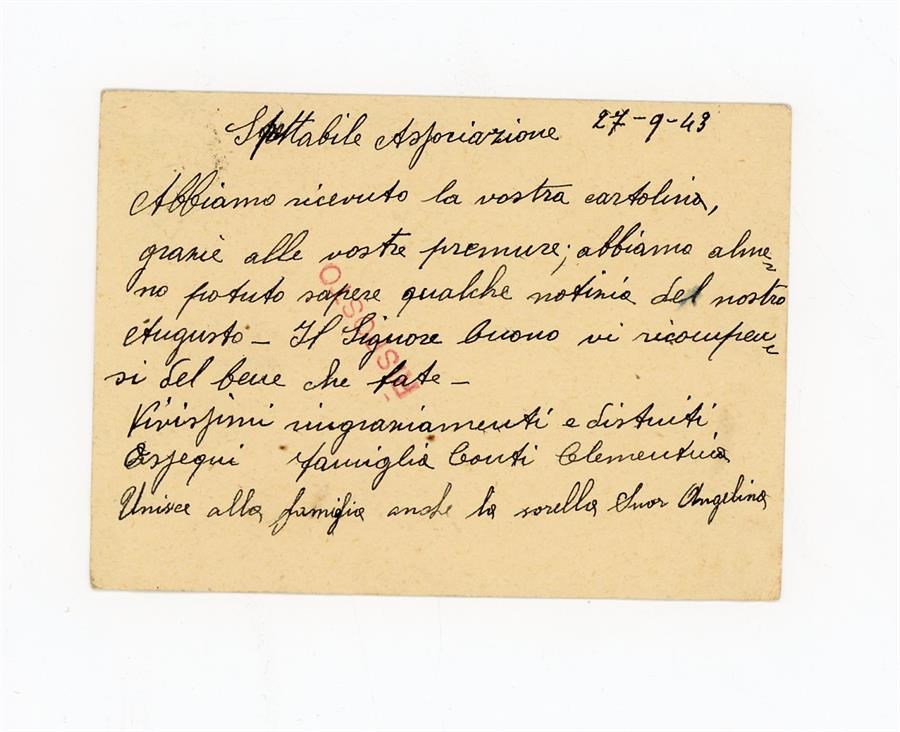 Cartolina postale di ringraziamento all'Associazione Giovanile Cattolica di San Giovanni di Casarsa di Conti Clementina e Suor Angelina, per aver ricevuto notizie di Augusto, fratello di quest'ultima. Il mittente scrive da Ozzano dell'Emilia, in provincia di Bologna.