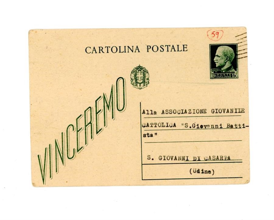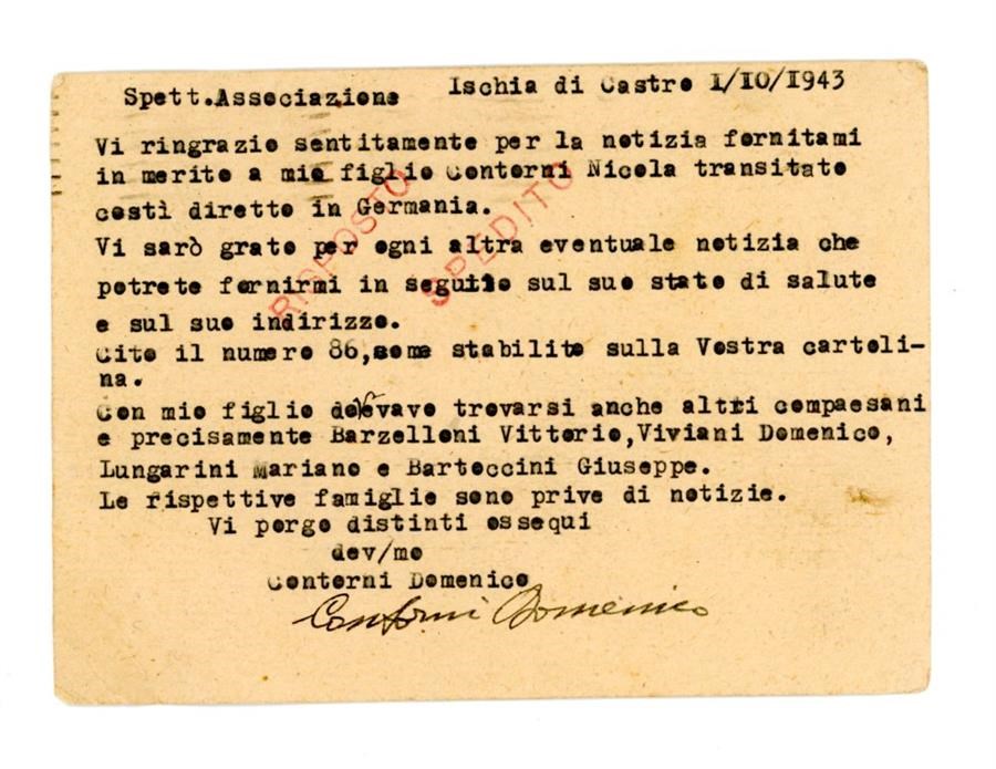 Cartolina postale di ringraziamento all'Associazione Giovanile Cattolica di San Giovanni di Casarsa da parte di Contorni Domenico, per aver ricevuto notizie del figlio Contorni Nicola. Il mittente chiede inoltre informazioni di Barzelloni Vittorio, Viviani Domenico, Lungarini Mariano e Bartoccini Giuseppe, soldati deportati e compaesani del figlio, per conto delle rispettive famiglie. Il mittente scrive da Ischia di Castro, in provincia di Viterbo.