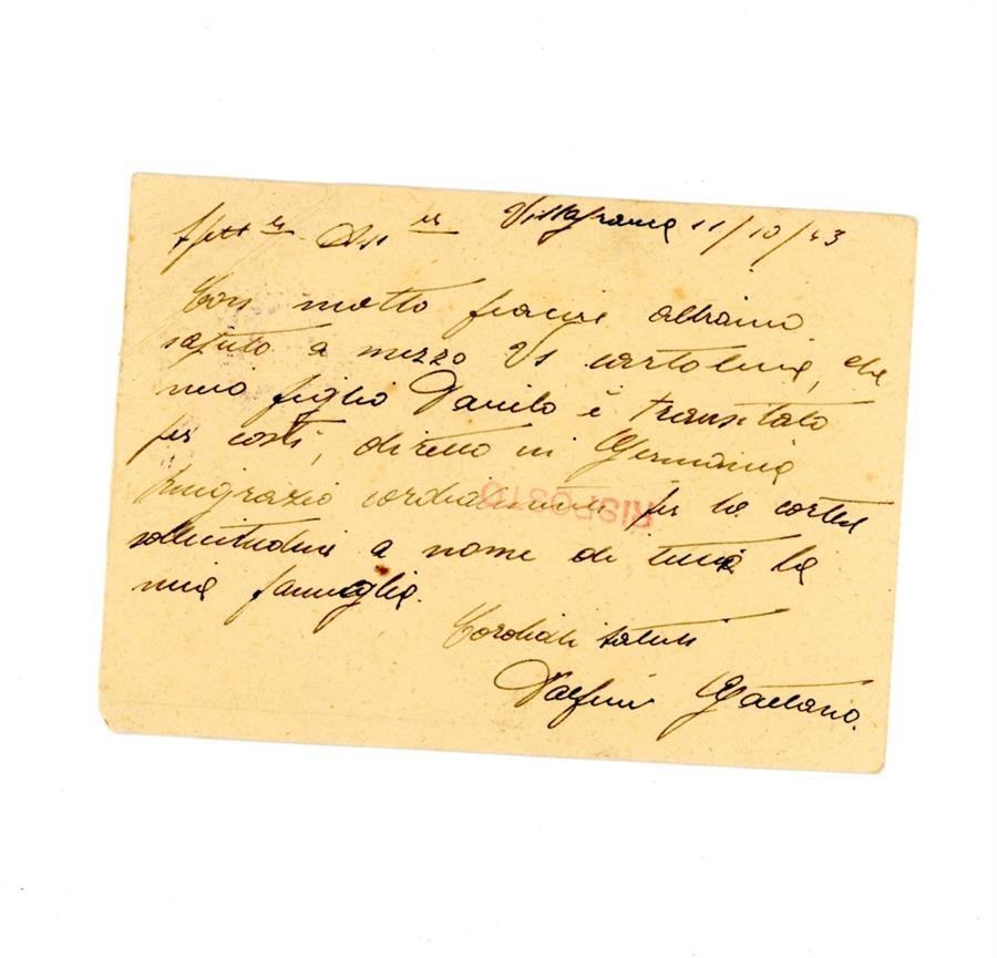 Cartolina postale di ringraziamento all'Associazione Giovanile Cattolica di San Giovanni di Casarsa da parte di Dalfini Gaetano, per aver ricevuto notizie del figlio Dalfini Danilo. Il mittente scrive da Villafranca di Verona.