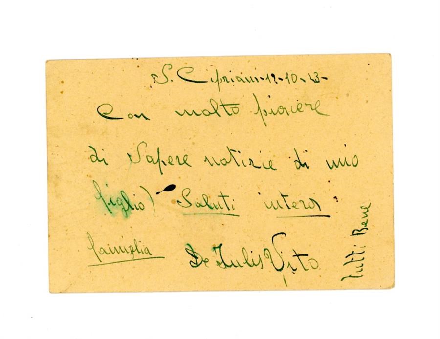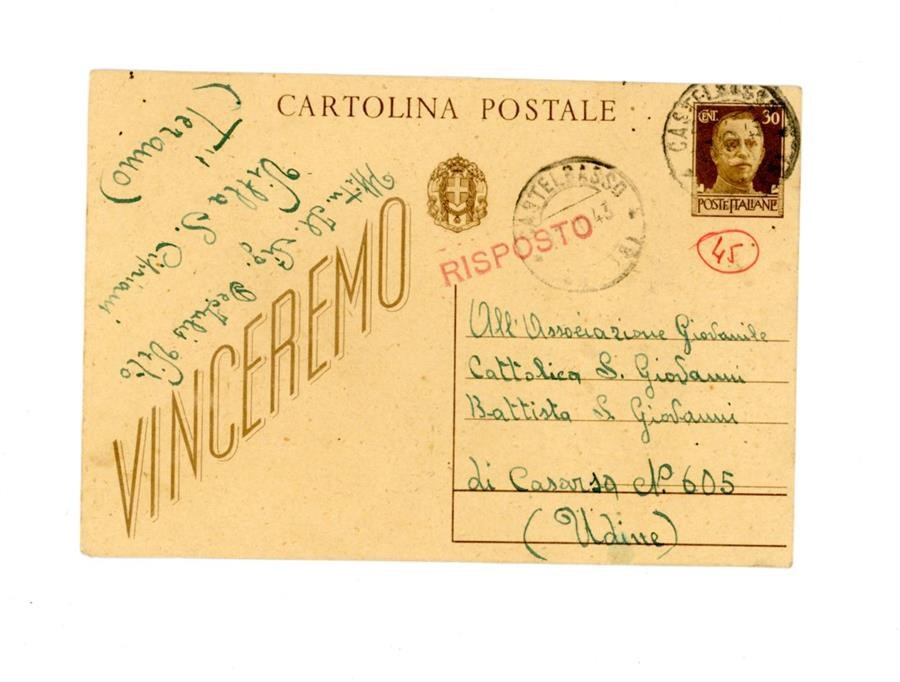 Cartolina postale di saluti all'Associazione Giovanile Cattolica di San Giovanni di Casarsa da parte di De Iulis Vito per aver ricevuto notizie del figlio. Il mittente scrive dalla località di San Cipriano di Castellalto, in provincia di Teramo.