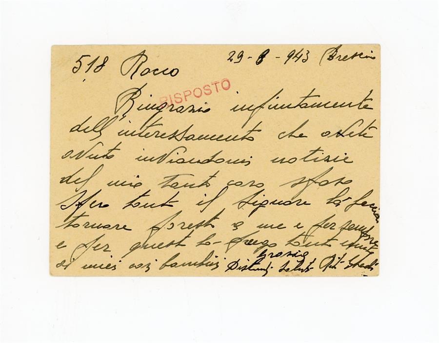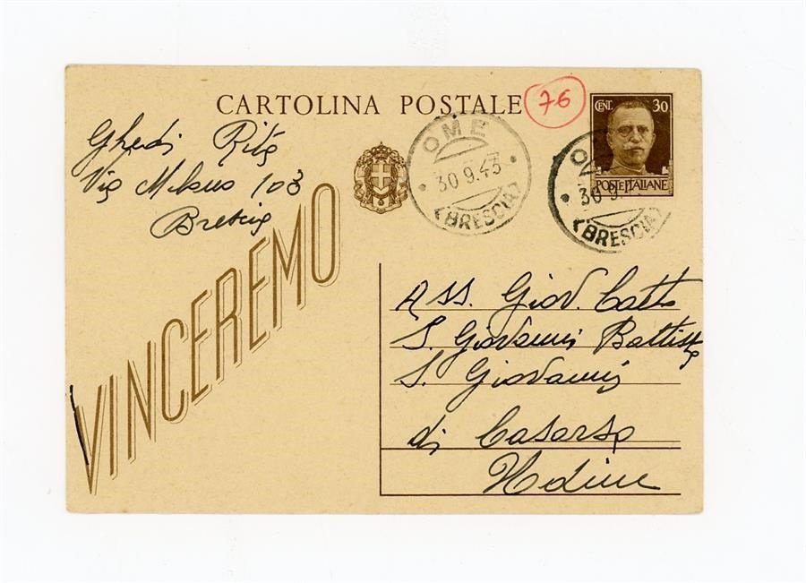Cartolina postale di ringraziamento all'Associazione Giovanile Cattolica di San Giovanni di Casarsa di Ghedi Rita, per aver ricevuto notizie del marito. Il mittente scrive da Brescia.