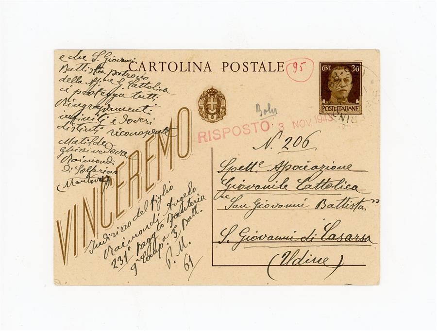 Cartolina postale di ringraziamento e richiesta di informazioni all'Associazione Giovanile Cattolica di San Giovanni di Casarsa da parte di Ghezzi Matilde, riguardo al figlio Raimondi Angelo. Il mittente scrive da Solferino, in provincia di Mantova.