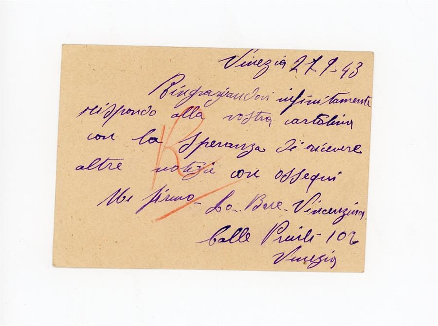 Cartolina postale di ringraziamento e richiesta di informazioni all'Associazione Giovanile Cattolica di San Giovanni di Casarsa di Lo Bue Vincenzina. Il mittente scrive da Calle Priuli, Venezia.