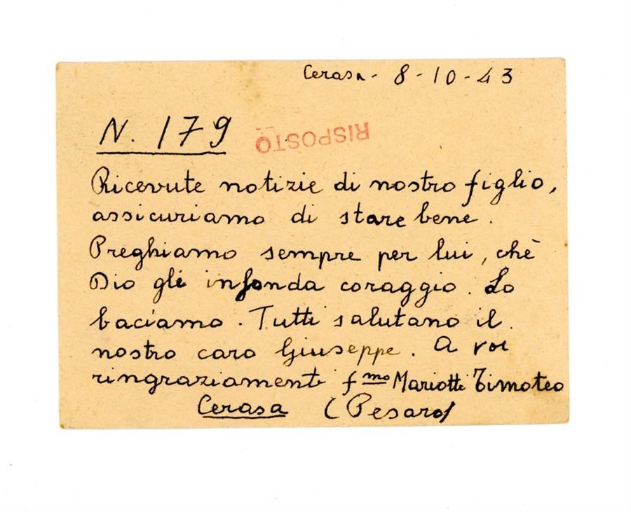 Cartolina postale di ringraziamento all'Associazione Giovanile Cattolica di San Giovanni di Casarsa da parte di Mariotti Timoteo per aver ricevuto notizie del figlio Giuseppe. Il mittente scrive dalla località di Cerasa di San Costanzo, in provincia di Pesaro Urbino.
