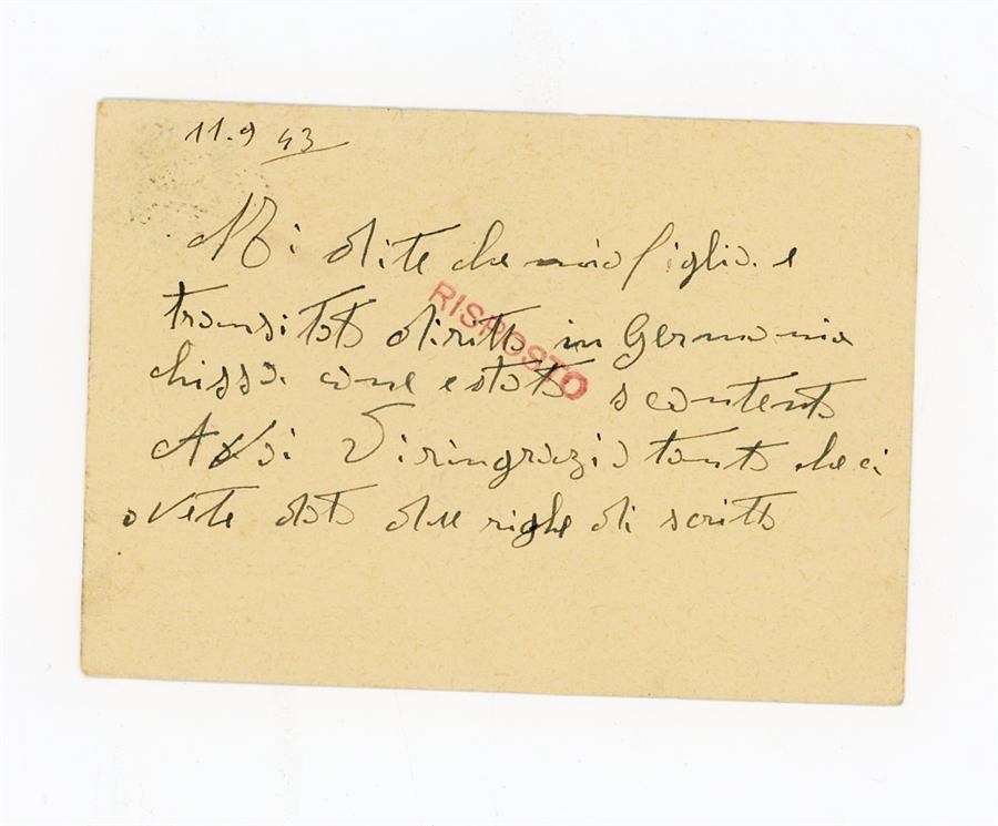 Cartolina postale di ringraziamento all'Associazione Giovanile Cattolica di San Giovanni di Casarsa di Martini Giuseppina, per aver ricevuto notizie del figlio. Il mittente scrive da Badia al Pino, località di Civitella in Val di Chiana, in provincia di Arezzo.