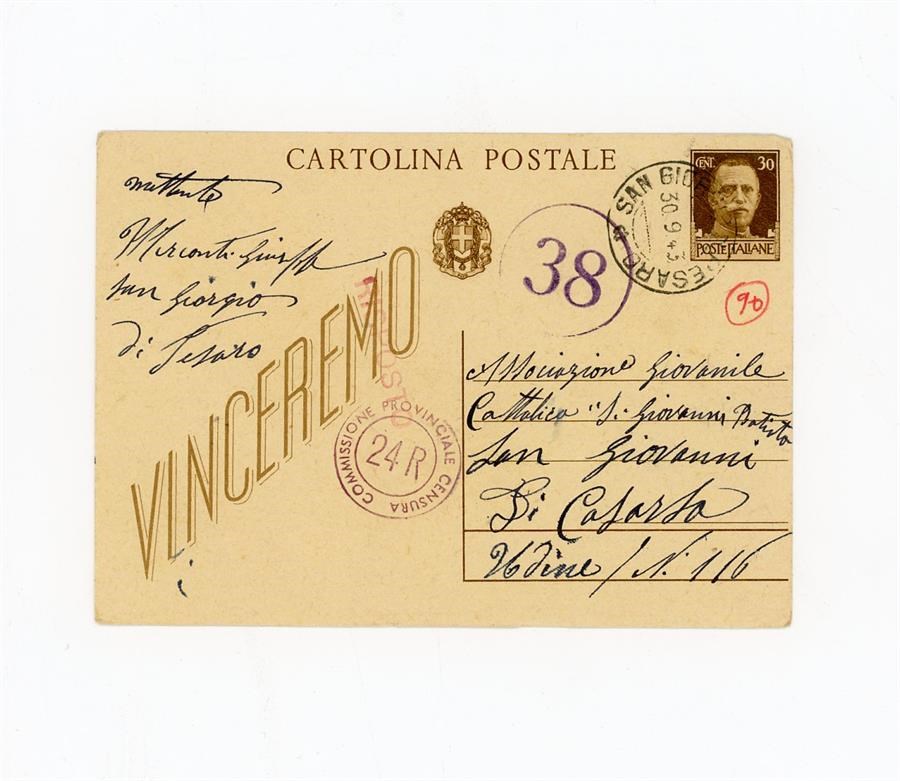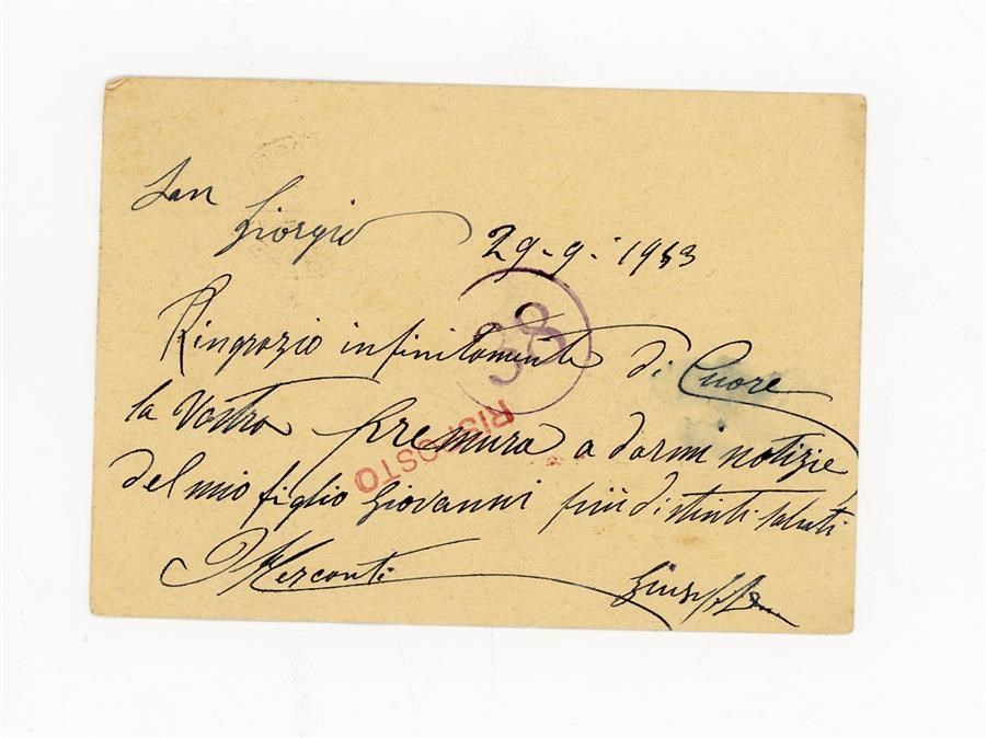 Cartolina postale di ringraziamento all'Associazione Giovanile Cattolica di San Giovanni di Casarsa di Mercanti Giuseppe, per aver ricevuto notizie del figlio Mercanti Giovanni. Il mittente scrive da San Giorgio di Pesaro, all'epoca comune in provincia di Pesaro Urbino, ora località del comune di Terre Roveresche, sempre in provincia di Pesaro Urbino.