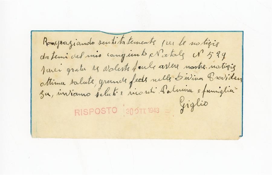 Lettera di ringraziamento di Palmira e famiglia Giglio, per aver ricevuto notizie del congiunto Natale.