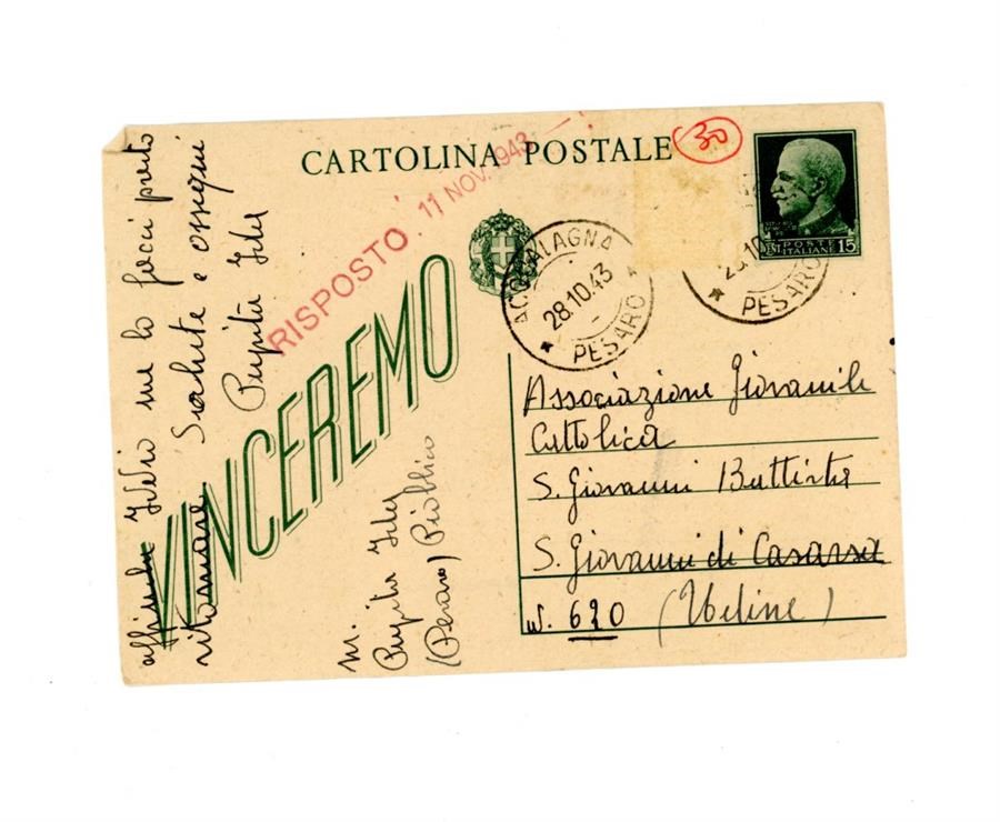 Cartolina postale di ringraziamento all'Associazione Cattolica di San Giovanni di Casarsa da parte di Pupita Ida, per aver ricevuto notizie del figlio. Il mittente scrive da Piobbico, provincia di Pesaro Urbino.