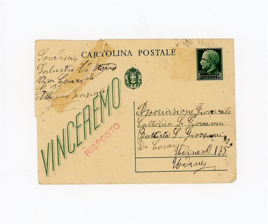Cartolina postale di saluti e baci di Salustri Vittorio, inviata all'Associazione Giovanile Cattolica di San Giovanni di Casarsa. Il mittente scrive da Albano Laziale, in provincia di Roma.