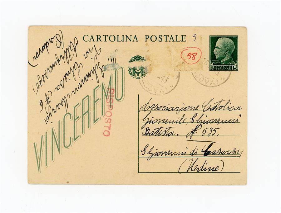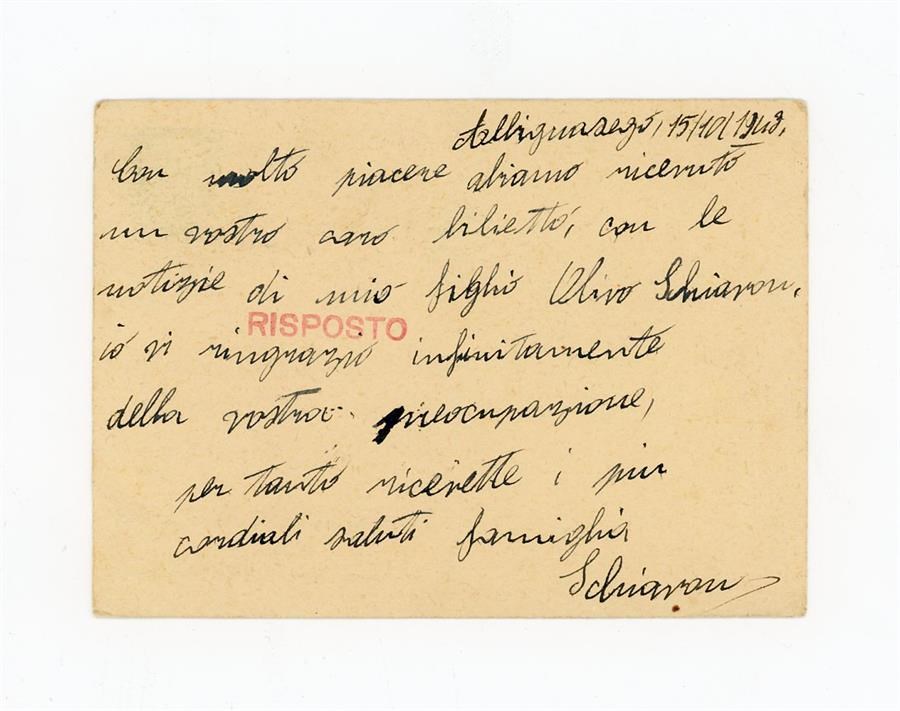 Cartolina postale di ringraziamento all'Associazione Giovanile Cattolica di San Giovanni di Casarsa di Schiavon Maria, per aver ricevuto notizie del figlio Schiavon Olivo. Il mittente scrive da Albignasego, in provincia di Padova.