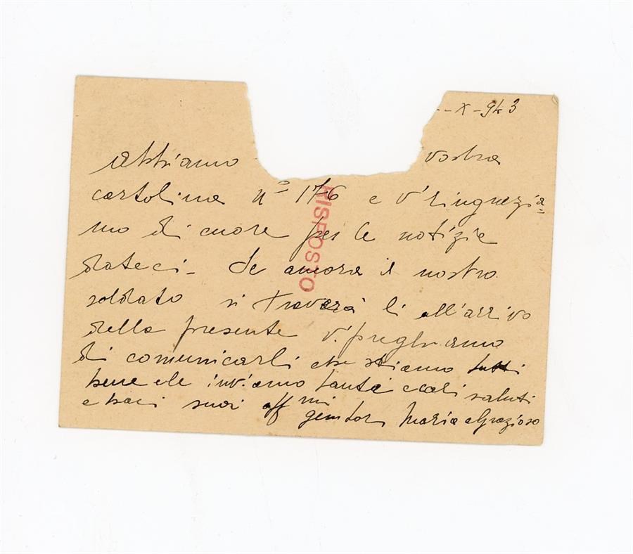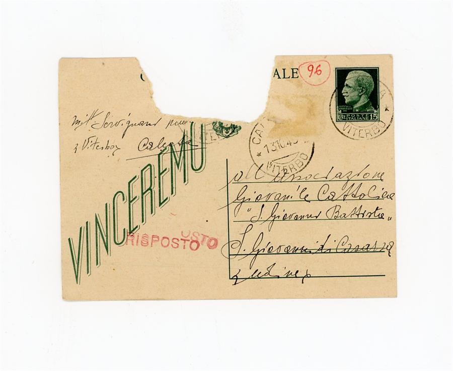 Cartolina postale di ringraziamento e di richiesta di informazioni all'Associazione Giovanile Cattolica di San Giovanni di Casarsa da parte di Servignani Maria, riguardo al figlio. Il mittente scrive da Calcata, in provincia di Viterbo.