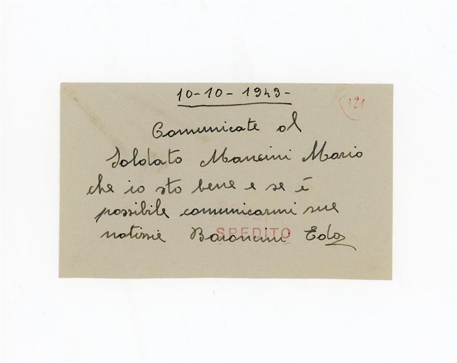 Lettera di Baroncini Eda all'Associazione Giovanile Cattolica di San Giovanni di Casarsa in cui comunica di stare bene e richiede informazioni riguardo il soldato deportato Mancini Mario. Il mittente scrive dalla località di Vicarello di Collesalvetti, in provincia di Livorno.
