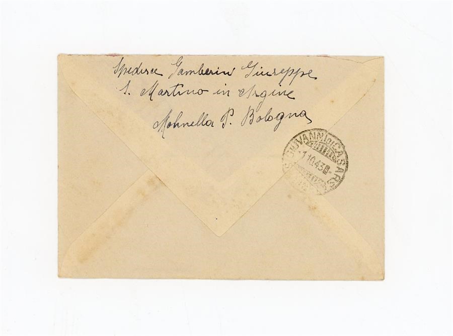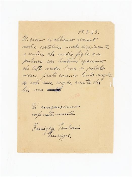 Lettera di ringraziamento all'Associazione Giovanile Cattolica di San Giovanni di Casarsa di Gamberini Giuseppe, per aver ricevuto notizie del figlio. Il mittente scrive da San Martino in Argine, frazione di Molinella, in provincia di Bologna.