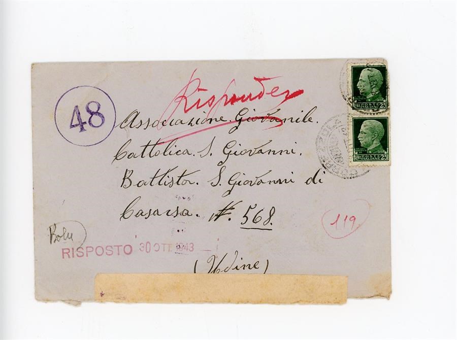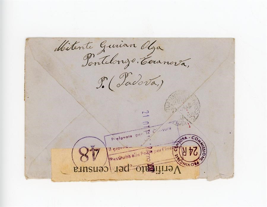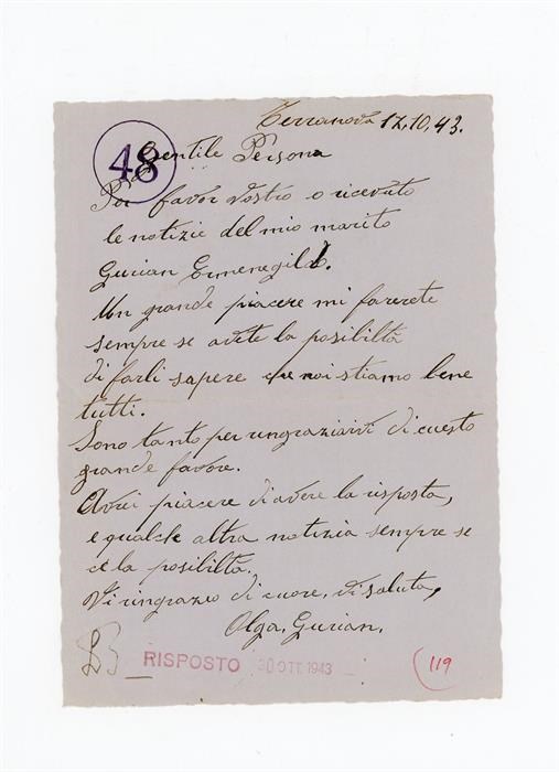 Lettera di ringraziamento all'Associazione Giovanile Cattolica di San Giovanni di Casarsa da perte di Gurian Olga, per aver ricevuto notizie del marito Gurian Ermenegildo. Il mittente scrive dalla località di Terranova di Pontelongo, in provincia di Padova.
