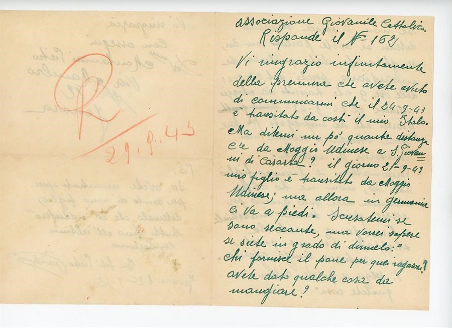 Lettera di ringraziamento e di richiesta di informazioni all'Associazione Giovanile Cattolica di San Giovanni di Casarsa da parte di Mantovani Pietro, riguardo al figlio Mantovani Italo. In particolare, il padre chiede se il figlio ha mangiato e come procede il suo transito verso la Germania dopo essere passato per Moggio Udinese. Il mittente scrive da Ferrara.