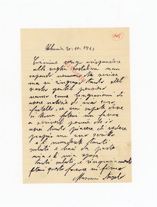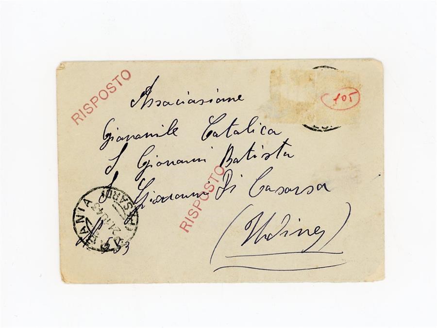 Lettera di ringraziamento all'Associazione Giovanile Cattolica di San Giovanni di Casarsa di Mazzoni Angelo, per aver ricevuto notizie del fratello. Il mittente scrive da Urbania, in provincia di Pesaro Urbino.