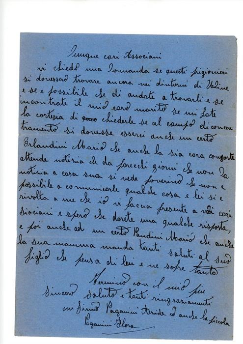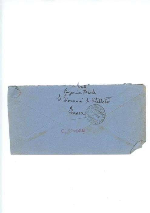 Lettera di ringraziamento e di richiesta di informazioni riguardo al marito all'Associazione Giovanile Cattolica di San Giovanni di Casarsa, parte di Paganini Aride. Il mittente scrive dalla località di San Giovanni di Ostellato, in provincia di Ferrara.