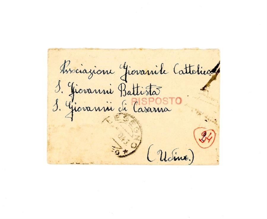 Bigliettino di ringraziamento all'Associazione Giovanile Cattolica di San Giovanni di Casarsa da parte di Sclavo Luigi per aver ricevuto notizie riguardo al figlio Sclavo Emilio. Il mittente scrive da Lesegno, in provincia di Cuneo. È presente la busta.