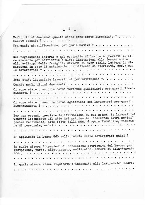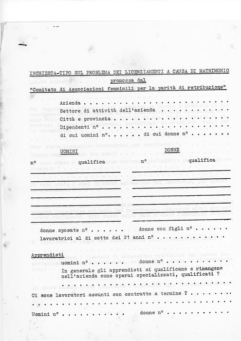 Lettere inviate dal Comiato nazionale dell'Udi ai comitati provinciali relative a: rinvio del convegno sui licenziamenti per matrimonio organizzato a Milano per il 3-4 dicembre 1960, clausola di nubilato per il personale femminile infermieristico impiegato presso gli Istituti manicomiali; si segnala un modulo non compilato dell'inchiesta-tipo sul problema dei licenziamenti a causa di matrimonio promossa dal Comitato di Associazioni femminili per la parità di retribuzione.