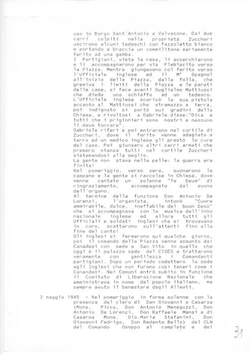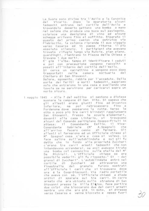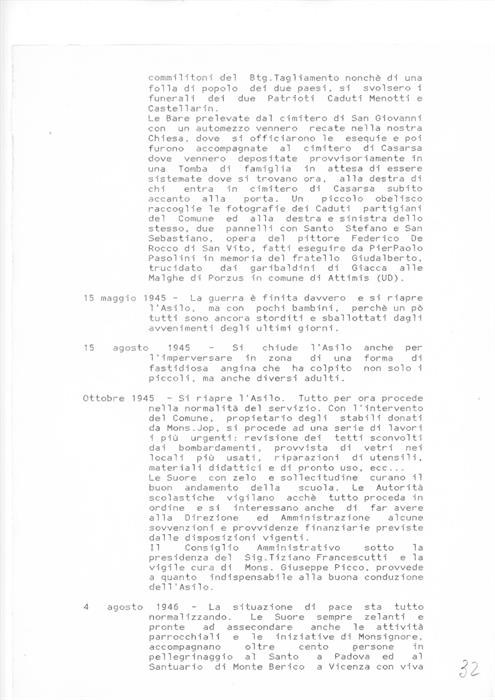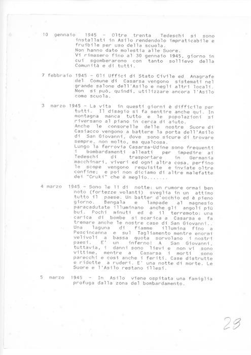5 pagine di diario anonime in cui si riportano eventi riguardanti le operazioni e i combattimenti tra soldati tedeschi, partigiani e alleati, e la successiva fine della guerra a Casarsa della Delizia e San Giovanni di Casarsa dal 10 gennaio 1945 al 4 agosto 1946. Le vicende sono legate in particolare all'utilizzo dell'asilo di San Giovanni di Casarsa durante l'occupazione tedesca e in seguito alla conclusione del conflitto.