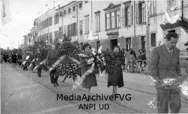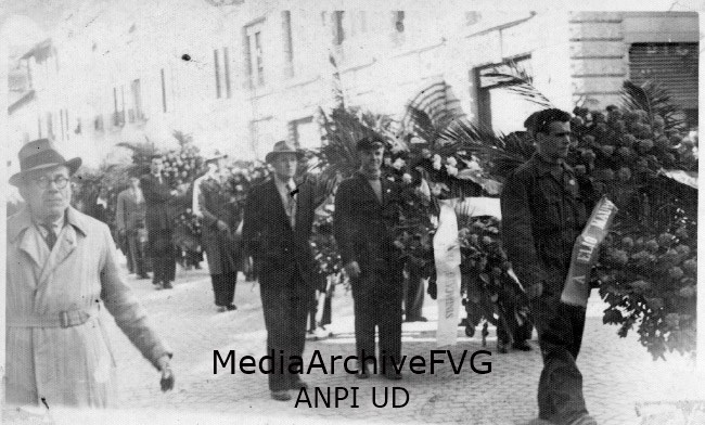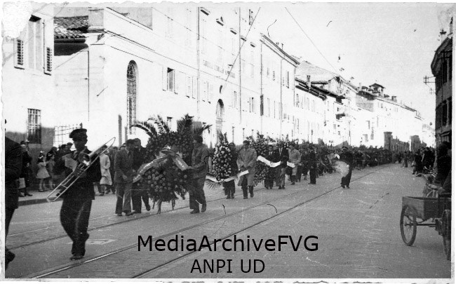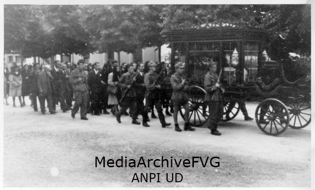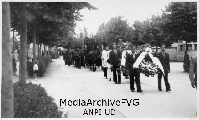 Corteo funebre percorre via Aquileia durante il funerale di un partigiano