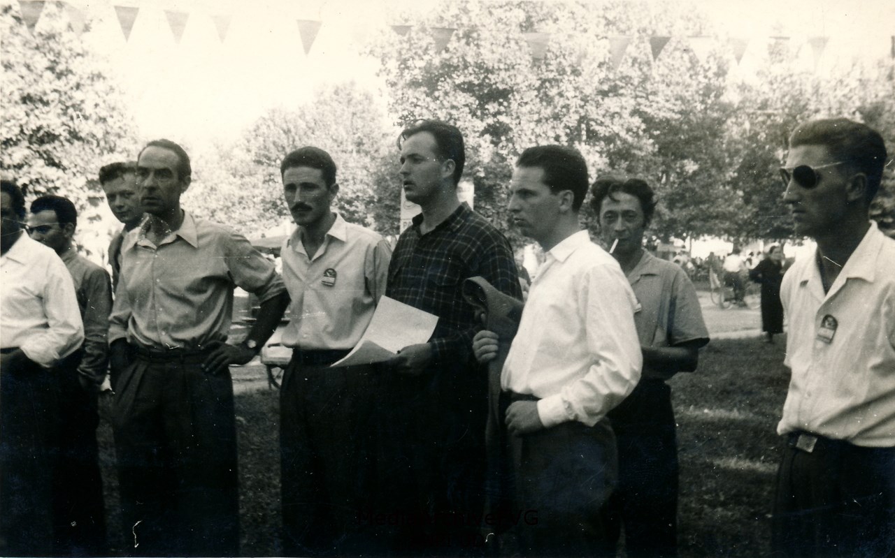 Partecipanti alla Festa dell'Unità. Si riconoscono Dino Basaldella Giovanni Toffolo Anzil, Elio Mauro, Severino Cavedoni e Giuseppe Zigaina